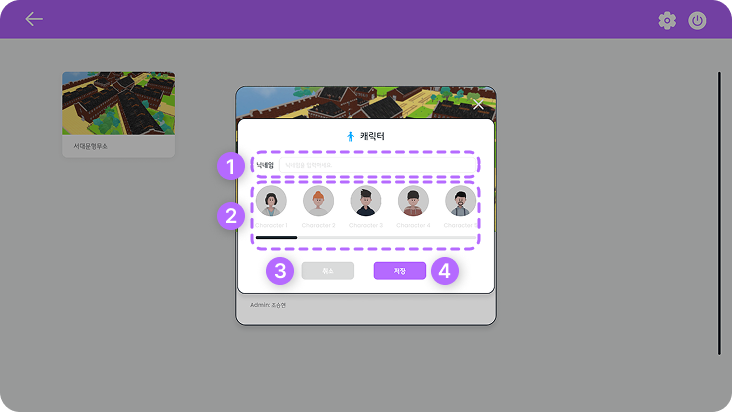 닉네임과 선택한 캐릭터를 저장하고 가상 공간으로 이동할 수 있습니다.