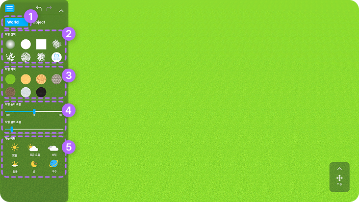 지형 높이 조절, 채색, 배경 선택 등 지형을 편집할 수 있습니다.