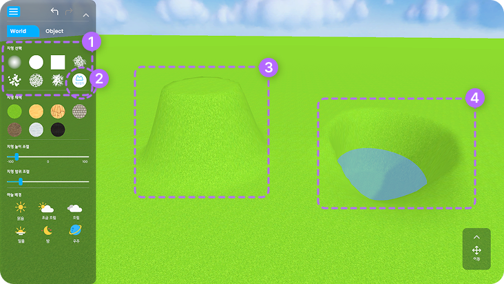 (1) 슬라이더를 좌,우로 움직여 편집할 지형의 크기와 높이를 조절할 수 있습니다.