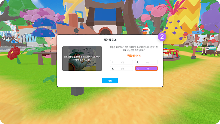 Play It!퀴즈이 페이지에서05. 퀴즈 1. 퀴즈 ? 아이콘 앞으로 이동하면 상단에 퀴즈 버튼이 나타나며, 버튼을 클릭하면 퀴즈 팝업이 나타납니다. 2. 퀴즈 팝업 퀴즈를 풀고 답에 대한 설명을 확인할 수 있습니다.