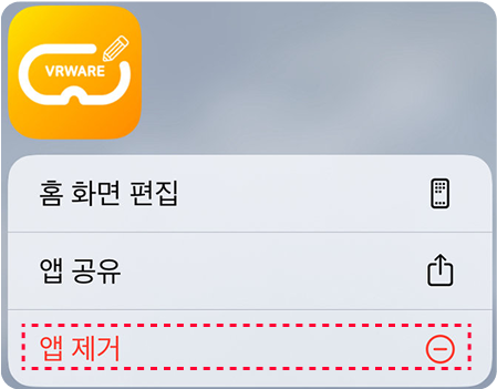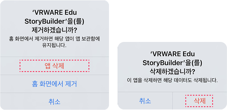프로그램 삭제하기프로그램 삭제하기 (iOS)이 페이지에서03. 프로그램 삭제하기 (iOS) 1. VRWARE Edu StoryBuilder 앱 클릭 어플을 꾹 눌러 '앱 제거' 버튼을 눌러줍니다. 2. VRWARE Edu StoryBuilder 제거 '앱 삭제' 버튼을 눌러 'VRWARE Edu StoryBuilder' 프로그램을 제거합니다.