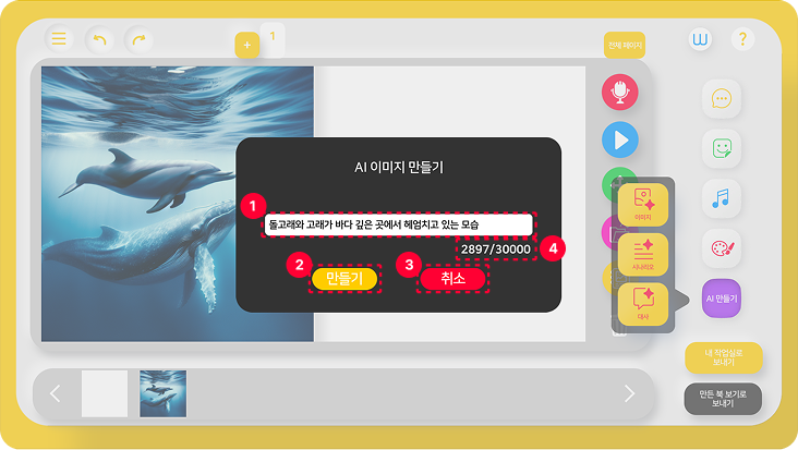 텍스트를 입력한 후 만들기 버튼을 클릭하여 AI 이미지를 만들 수 있습니다.