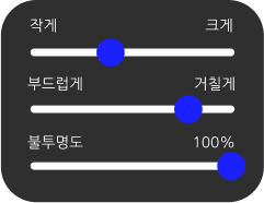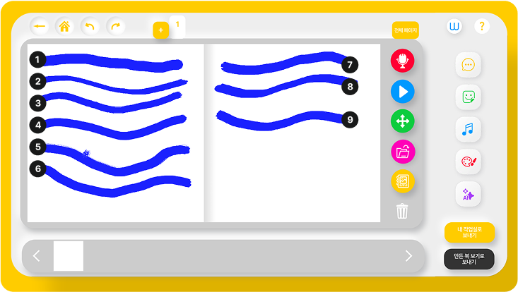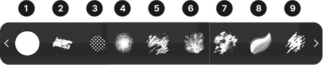 메인 기능브러쉬 종류이 페이지에서02. 브러쉬 종류 1. 브러쉬 종류 (총 9종) (1) 다양한 브러쉬 종류를 활용하여 색칠할 수 있습니다. (2) 붓의 크기 조절, 질감, 투명도를 선택할 수 있습니다.