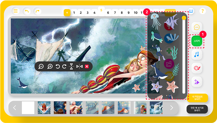 메인 기능스티커로 꾸미기이 페이지에서05. 스티커로 꾸미기 1. 스티커 버튼 스티커를 넣어 동화책을 꾸밀 수 있는 기능입니다. 2. 스티커 선택 다양한 스티커를 선택할 수 있습니다.