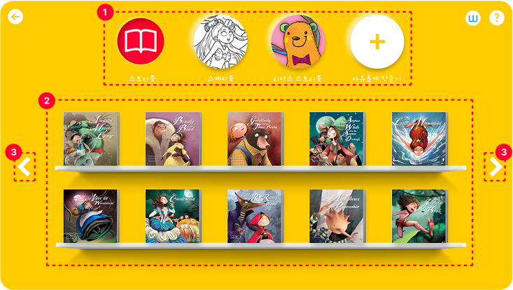 명작 동화 스토리북, 명작 동화 스케치북, 리더스 스토리북, 자유롭게 만들기 중 원하는 작업 모드를 선택합니다.