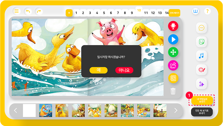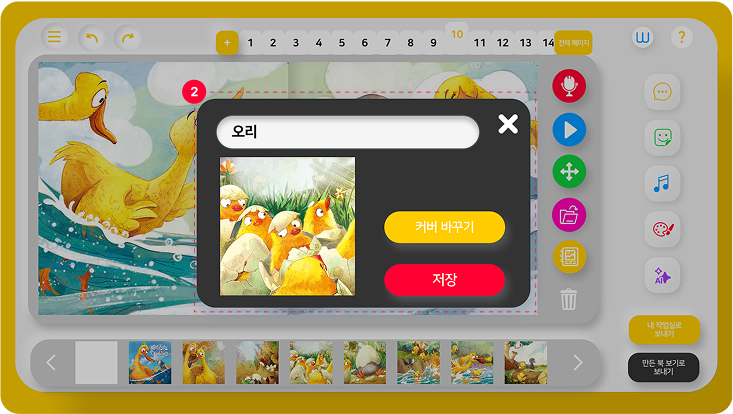 저장 및 삭제하기내 작업실로 보내기이 페이지에서04. 내 작업실로 보내기 1. 내 작업실로 보내기 버튼 내 작업실로 보내기 버튼 클릭 시 '임시저장 하시겠습니까?' 팝업창이 생성됩니다. 2. 북 커버 설정하기 북 커버를 설정하고 제목을 입력하여 '저장' 버튼을 누르면 작업실로 보낼 수 있습니다.