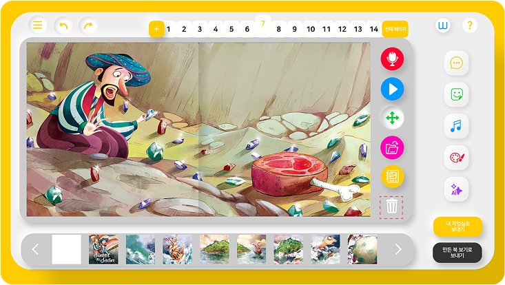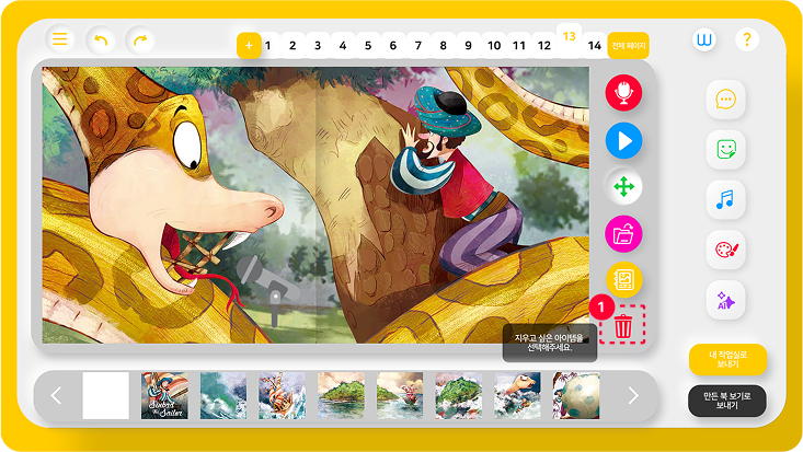 저장 및 삭제하기작업 삭제하기이 페이지에서06. 작업 삭제하기 1. 휴지통 아이콘 지우고 싶은 말풍선이나 스티커를 클릭하여 삭제할 수 있습니다. (붓으로 그린 작업은 지우개로만 지울 수 있습니다.) 휴지통 아이콘 클릭 전 화면