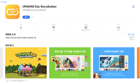 시작하기설치 진행 (iOS)이 페이지에서05. 설치 진행(iOS) 1. 앱스토어에서 설치를 진행합니다. 홈페이지의 다운로드 페이지에서 다운로드하는 방법 외에도 QR코드를 스캔하거나 앱스토어에서 [VRWARE Edu StoryBuilder]를 검색 후 앱을 다운로드 하실 수 있습니다.