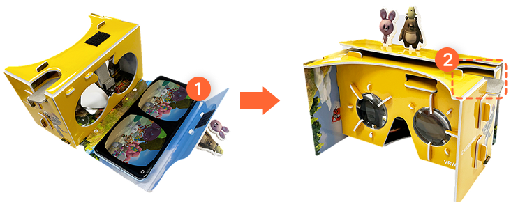 카드보드 흡착판에 VR 모드로 전환한 화면이 위로 오게 모바일 기기를 부착합니다.