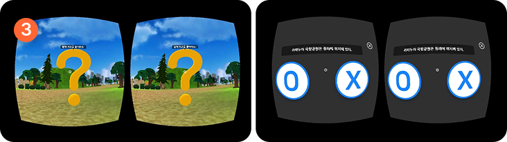 퀴즈 오브젝트에 다가가 퀴즈를 풀 수 있으며, 풀이 시 가운데 하얀 점을 이용해 버튼을 선택할 수 있습니다.