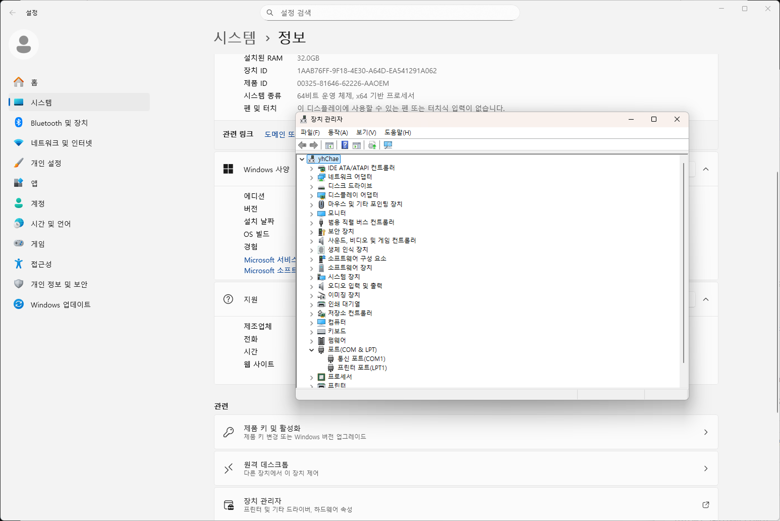 1. 장치 관리자 -> 포트 (COM & LPT) 메뉴에서 연결된 통신 포트의 번호를 기억합니다.