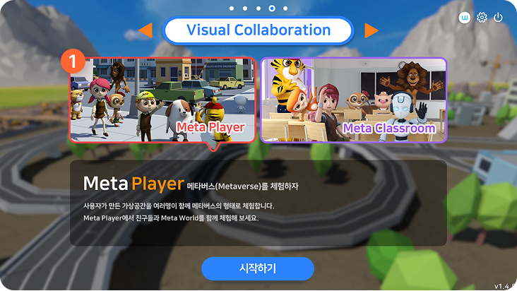 Meta Player Meta Player 시작이 페이지에서01. Meta Player 시작 1. Meta Player 메인 화면에서 Meta Player를 선택하여 다중 접속하여 맵을 체험할 수 있습니다.